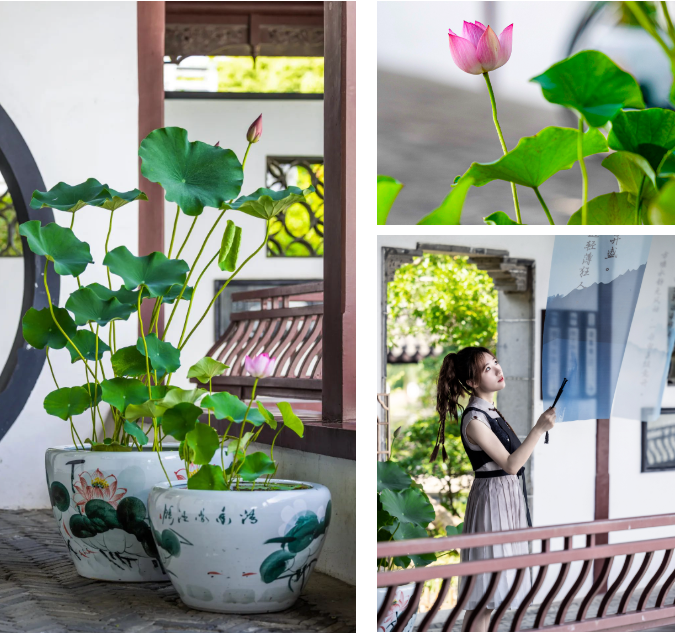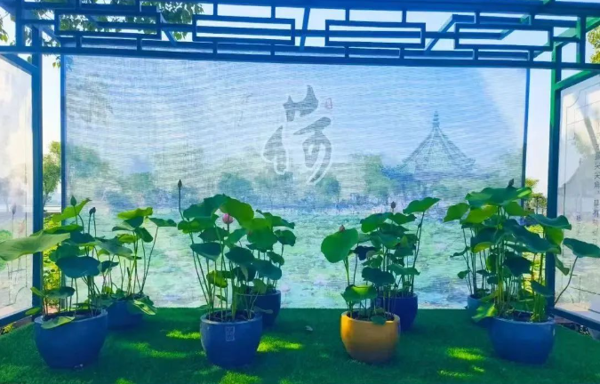 千步长廊上水墨氤氲的诗词纱幔、古朴雅致的屏风、精巧玲珑的竹编艺术品,搭配着粉墙黛瓦,数十缸花色各异荷花围绕其间.....漫步长廊上,蠡湖美景尽收眼底,四周荷花香气环绕,诗词纱幔间隐现粉艳花朵,虚虚实实,好一幅诗情“花”意。
