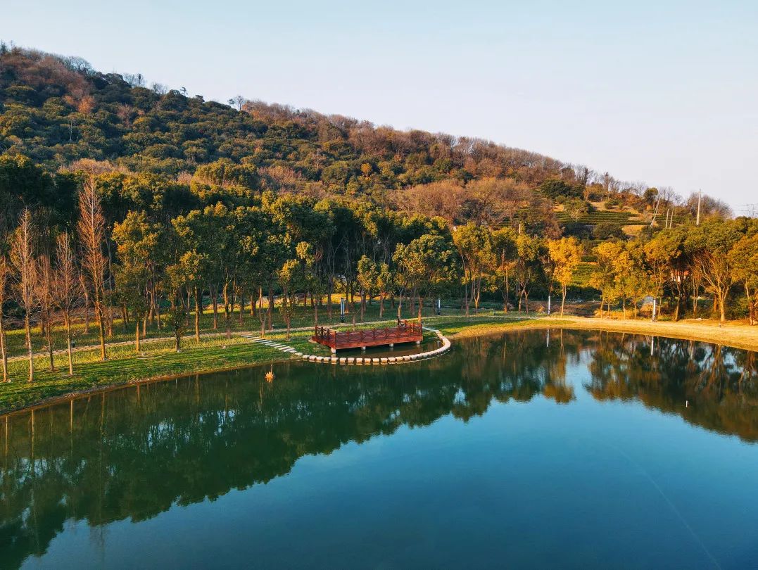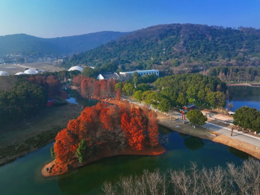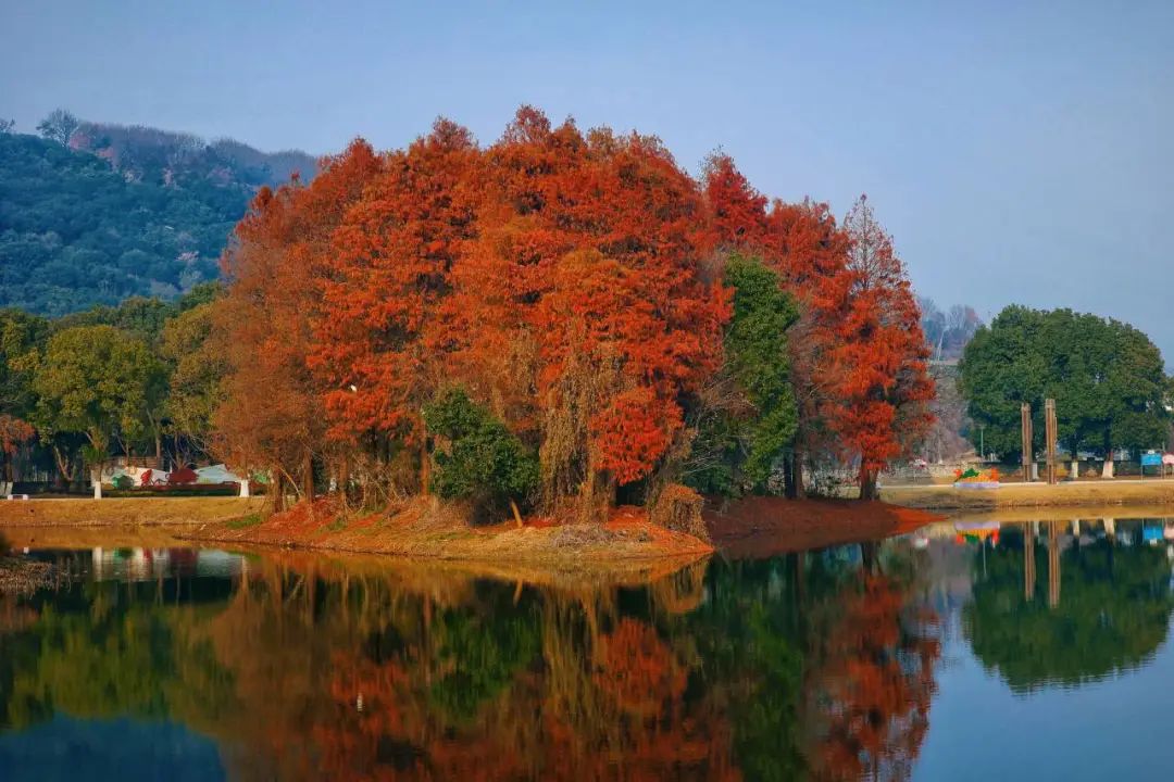 此时,万丰湿地公园内的红杉正是最靓眼的时候,清澈的水面上燃起了一片热烈的火红,在四周苍翠的山峦之间显得尤为耀眼。