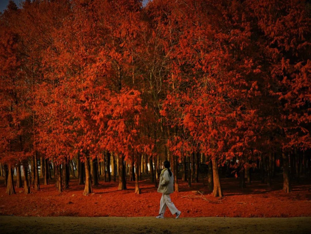漫步湖畔,红杉似珊瑚灼海、彩霞万丈,飞鸟在林间掠过,绯红的一片,如同掉进了油画世界。地面落满层层叠叠的落叶。阳光倾泻而下,抬头望去。满眼都是彩叶斑斓的世界,让人忍不住驻足流连,用镜头记录这难得的美景。