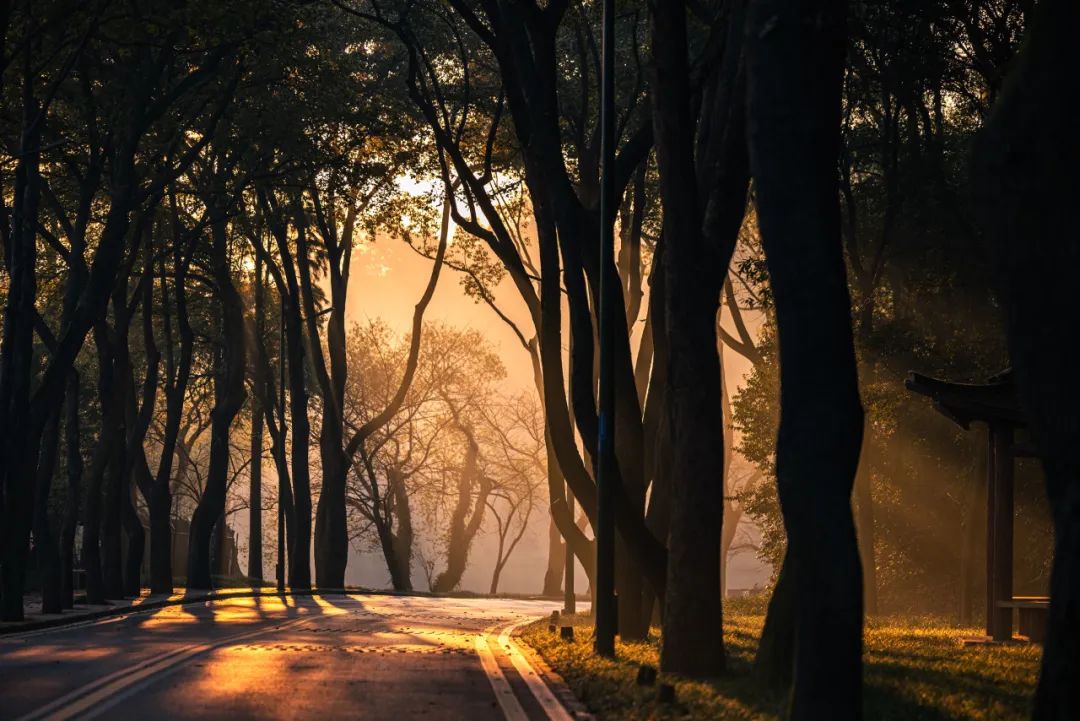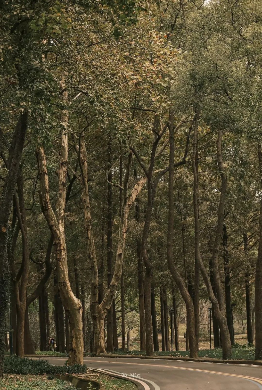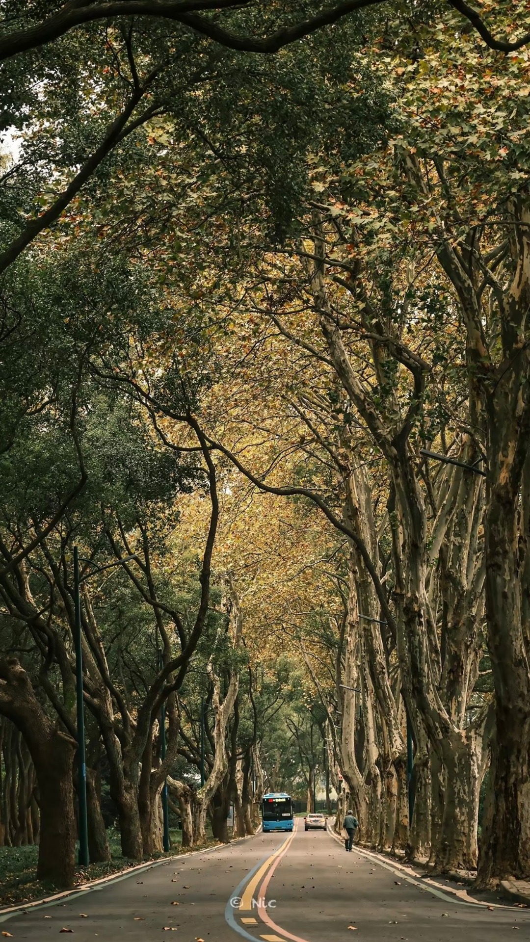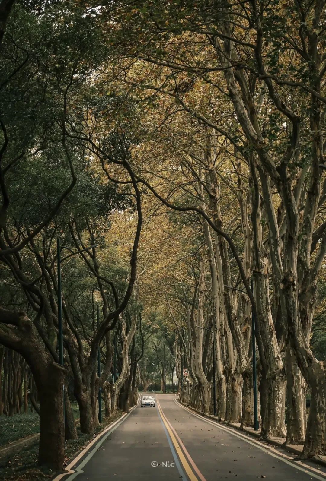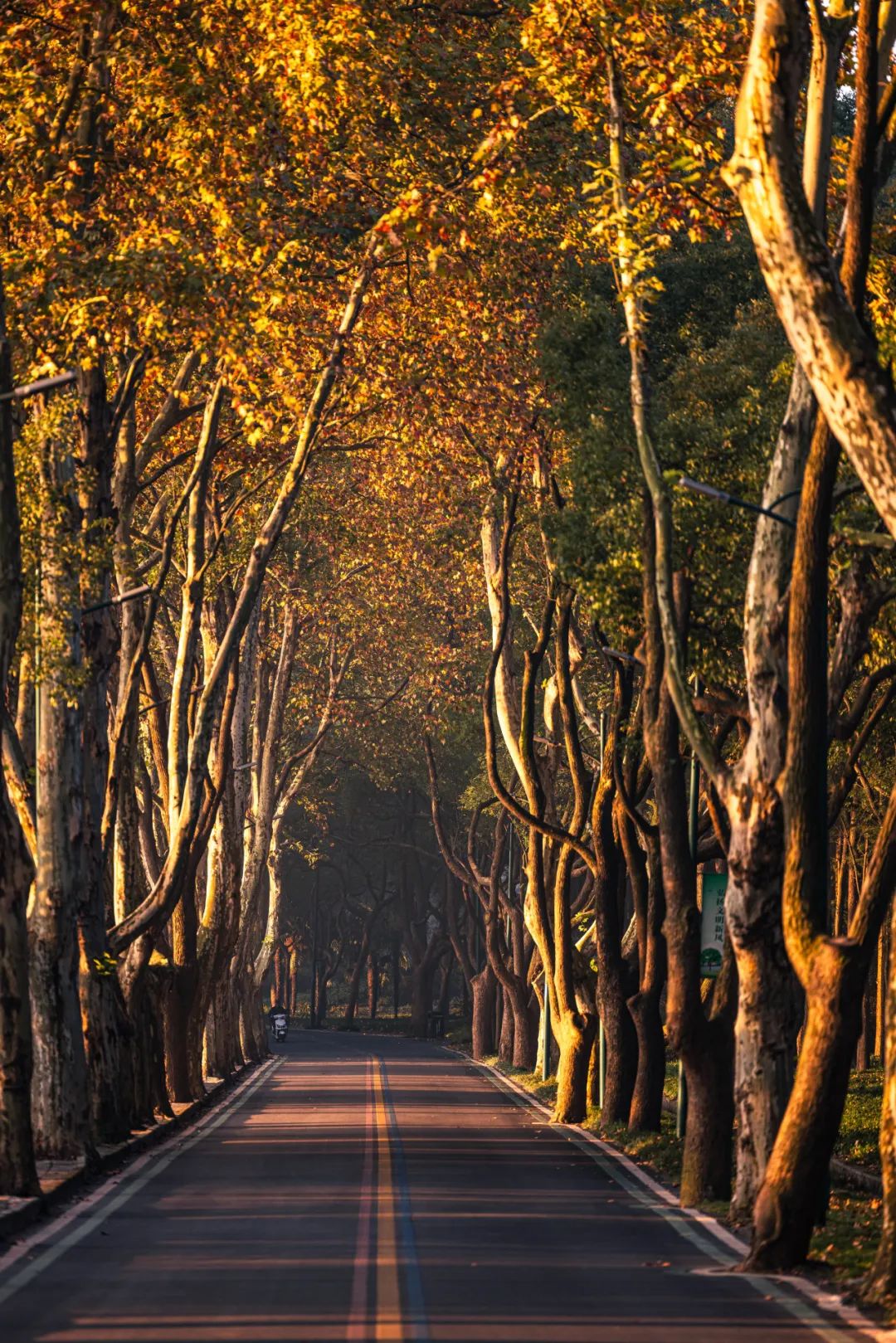 悄悄泛黄的梧桐叶让这条道路显得极具电影氛围感的浪漫!梧桐叶在微风的吹拂下簌簌作响、悠然飘落,阳光透过树叶间的缝隙洒到地面上,光影斑驳,温馨且静谧!