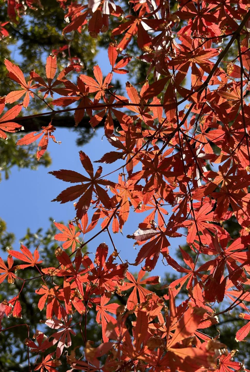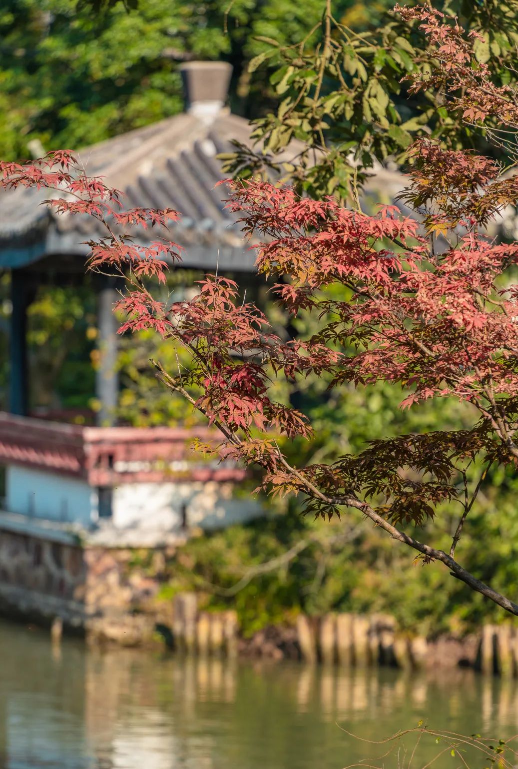 从充山隐秀出发朝着挹秀桥前行再到核心景区,这一路上都可以发现一株又一株的红枫,每每看到都会都感到非常的明艳惊喜!秋尽冬将至,生机殆失,唯有这红如火的枫让人心生明媚!