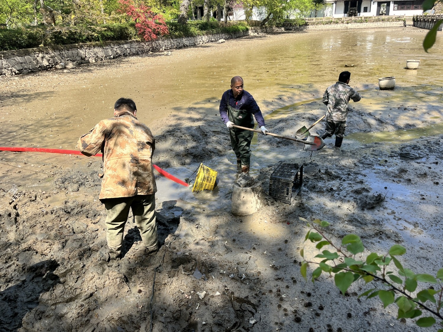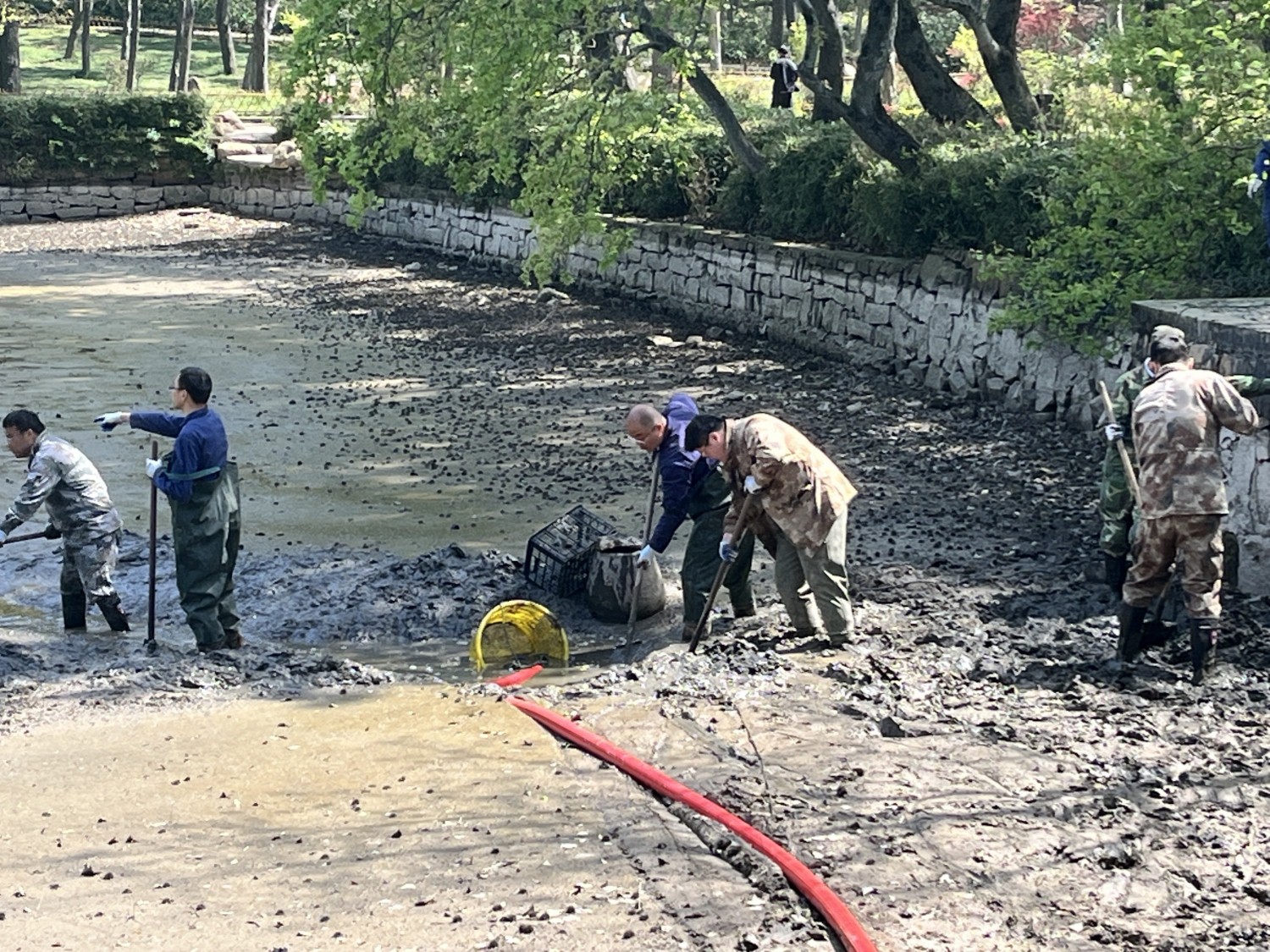 由于长期未进行全面清淤,加之鲤鱼等观赏鱼类饲养密度过高,造成水体富营养化,影响了十景塘的观赏性。为从根本上解决这一问题,苏州市天平山风景名胜区管理处坚持领导班子带头,党员和中层骨干冲锋在前,全员共同参与,对十景塘展开清淤工作。管理处工作人员下到塘底,对淤泥、碎石、瓦砾、杂物进行地毯式清理。现场清理出的淤泥作为优质的有机肥料,被统一运往景区苗圃,用于景观植物的栽培,实现了循环再利用。