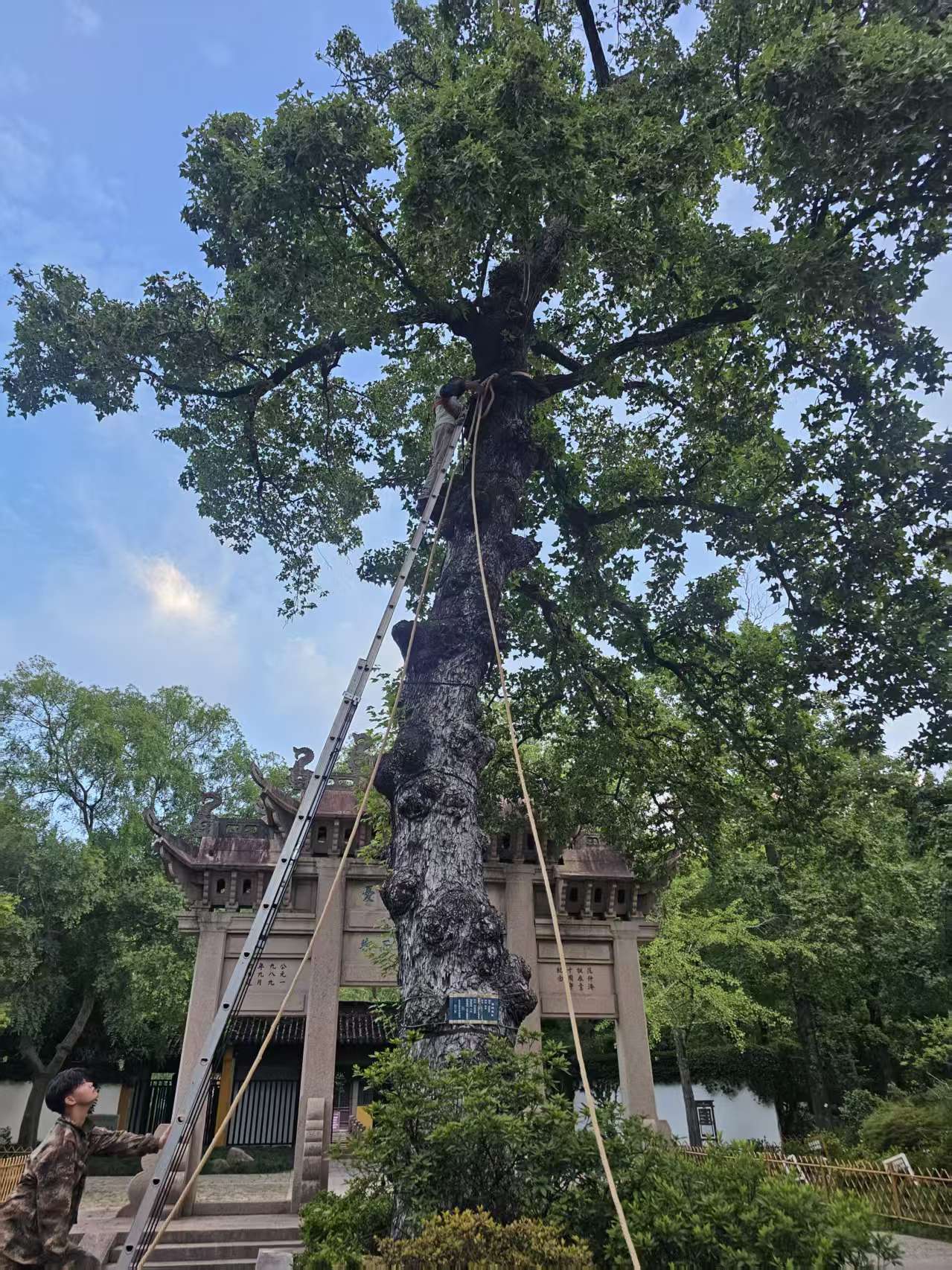 除病虫害防治外,管理处还组织专业团队对古树进行了全面“体检”,对存在安全隐患的树木实施临时牵拉加固。同时制定了详细的极端天气应急预案,配备专业设备和人员,确保古树安全度过汛期。
