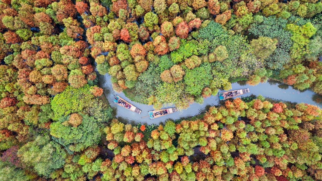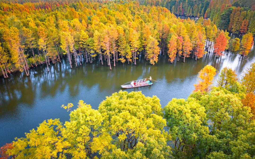 从深秋到初冬,尚湖水上森林仿佛已从赭石色的水墨画,过渡成色彩艳丽的油画,为尚湖萧瑟的冬日抹上一片温暖的亮色与点睛之笔。在初冬时节,乘坐竹筏漫游其中,可观赏在阳光的照耀下风采艳丽的抹池杉,感受“树在水中生,船在林中行,鸟在枝头叫,人在画中游”的浪漫惬意。