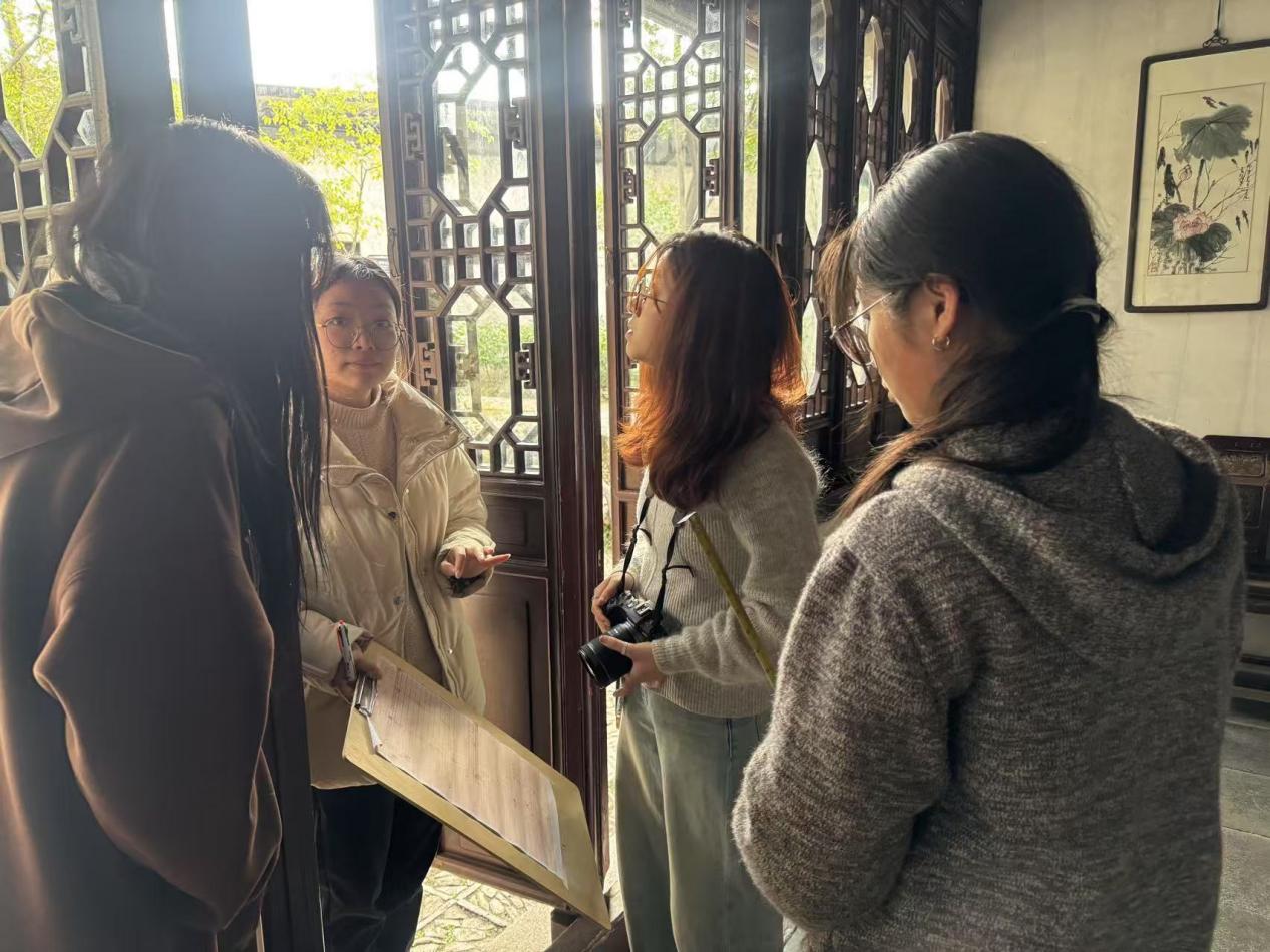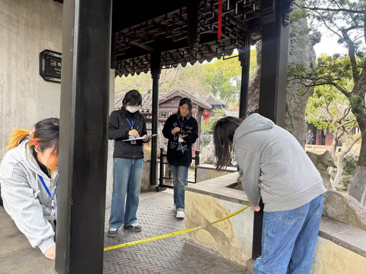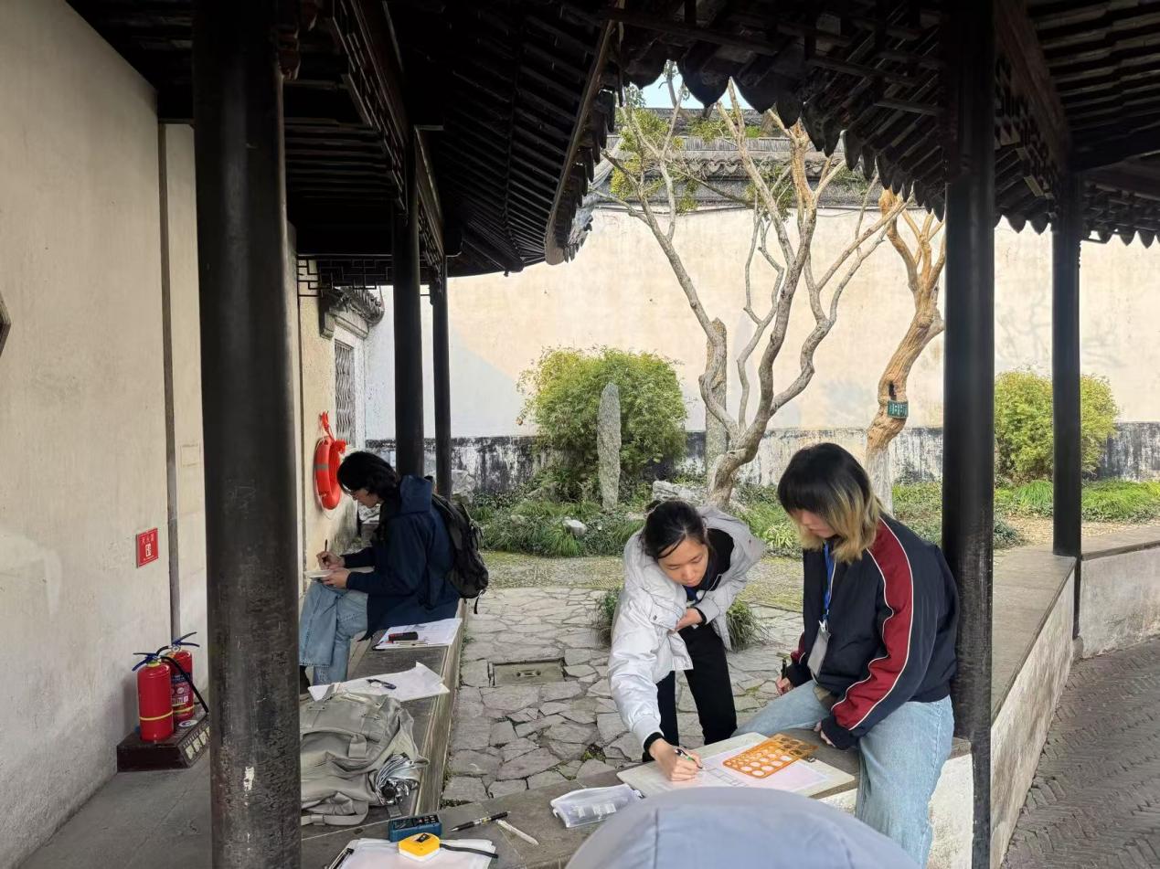 在为期5天的课程中,学生们聚焦“闹红一舸”的船厅悬挑、“水香榭”的借景玄机、”退思草堂“的轴线韵律,从整体格局到0.5厘米精度的雕花,用传统皮尺与激光测距仪双重校验,还原了古人"咫尺之内再造乾坤"的空间哲学。