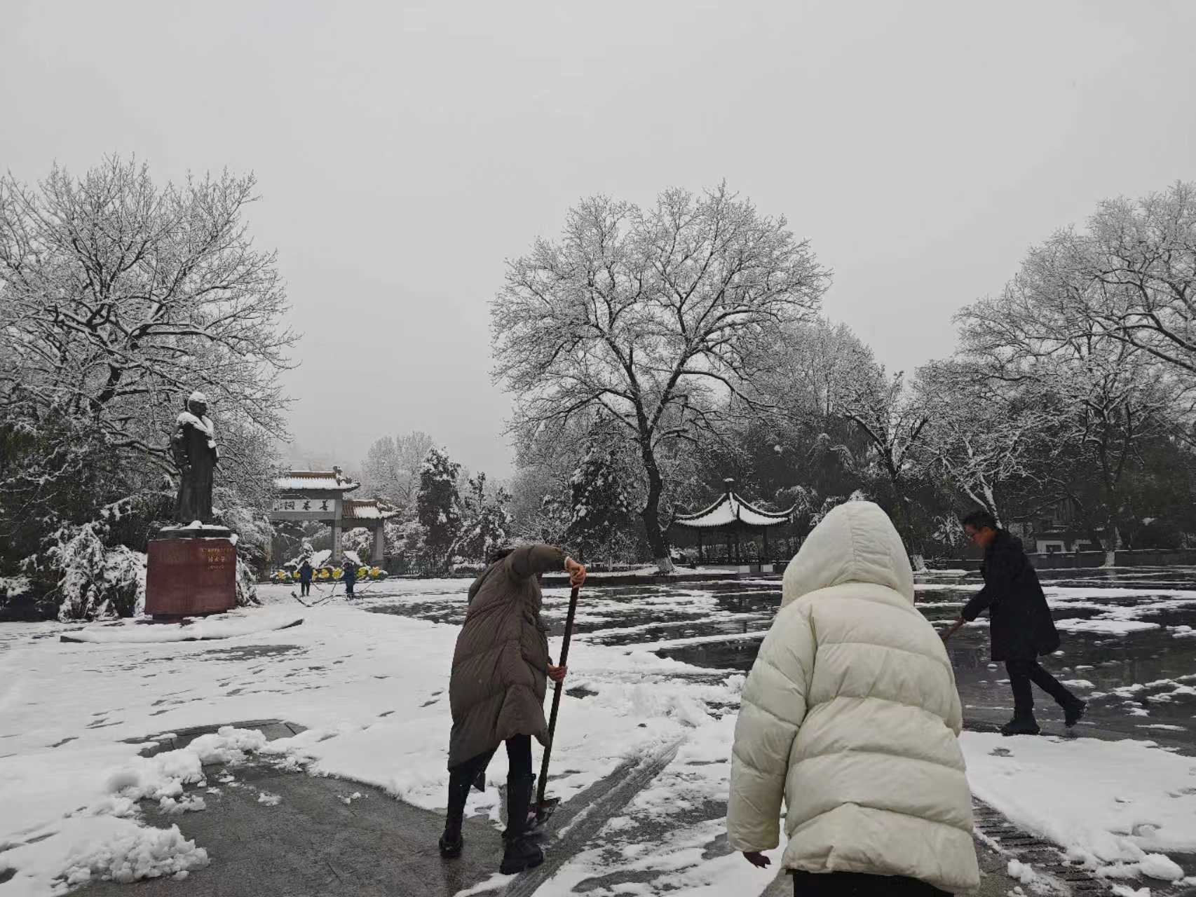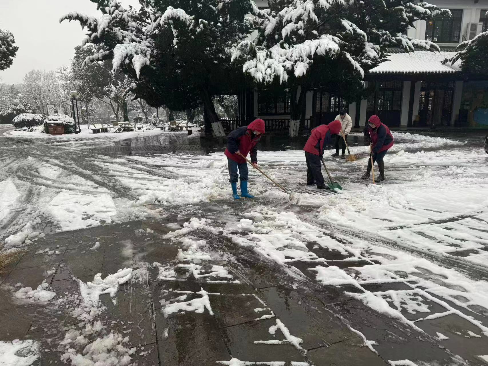 一场鹅毛大雪,为善卷洞换上了洁白的盛装。美丽雪景的背后是可能出现景区游线道路结冰与积雪,为了尽快消除路面冰雪,确保游客游览安全,早上善卷洞员工在各部门负责人的带领下,大家分工明确,默契配合,在寒冷的冬日早晨,天上飘落的雪花与大家忙碌的身影,构成了一道亮丽的风景线。