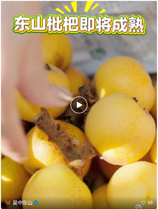 吴中区东山镇是我国枇杷种植传统四大产区之一,东山白沙枇杷最为著名,明代《学圃杂疏》就有记载,“枇杷出东洞庭者大”,清代《太湖备考》上说:“枇杷出东山白沙。”近年来,东山白沙枇杷获得农产品地理标志登记、地理标志证明商标及全国名特优新农产品等国家级荣誉奖项,更收获了“世界枇杷看中国,中国枇杷问东山”的美誉。