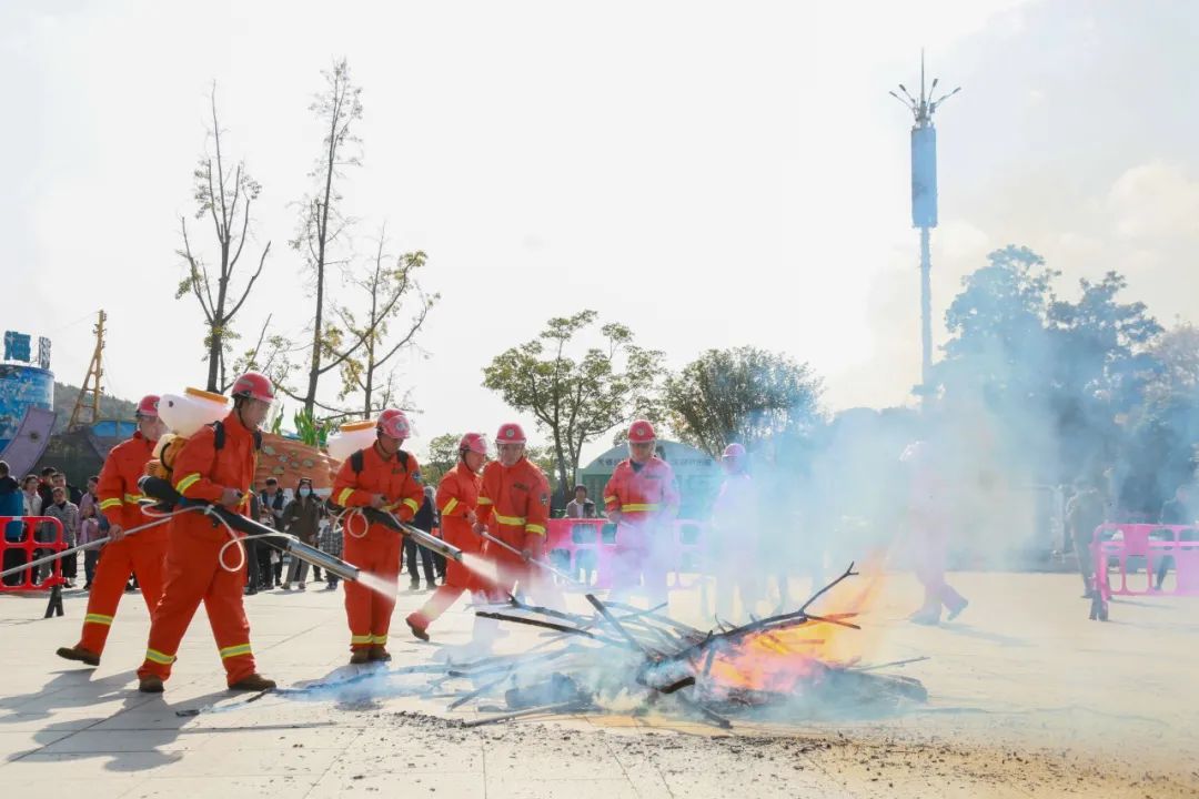 演练启动前,景区董事长、总经理许祥准进行了动员讲话,希望通过本次演练激发全员关注消防安全、学习消防知识、参与消防工作的主动性,增强维护景区消防安全的责任感。随后参演人员一同观看了景区应急救援队灭火科目展示,应急队员分组使用风水灭火机、架设高扬程水泵对目标火源实施灭火作业。消防灭火实操演练中,参演人员分两组,按照“一提、二拔、三喷”的操作要领,使用消防灭火器对火源进行扑灭。