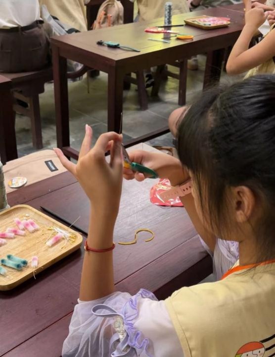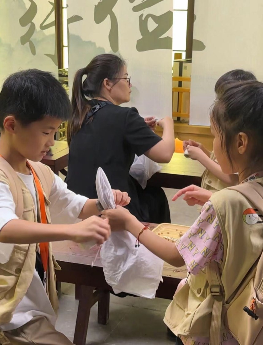 在天平山暑期研学课堂,孩子们可以体验草木染、绒花等非遗项目。管理处邀请非遗传承人为孩子们介绍扎染、绒花的历史背景、文化意义及基本技法,让孩子们对博大精深的中国传统手工艺产生认识和兴趣。讲解完毕,专业老师带领孩子在天平山景区内探寻植物的奥秘,将植物科普与非遗文化有机融合在一起。随后,在老师的帮助下,孩子们亲自动手进行栀子染和绒花制作实践活动。从折叠、捆绑布料到再到亲手浸染,每个环节都充满了探索的乐趣。绒花的制作更是需要孩子的耐心和细心,最后看着成品孩子脸上洋溢着成就感和喜悦之情。