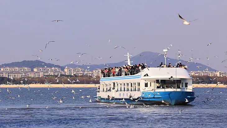 冬日里最有趣的事情莫过于乘坐太湖游船与红嘴鸥来一场近距离的亲密互动,它们可一点也不认生,在湖面上嬉戏、飞翔、觅食,犹如一群“精灵”给平静的太湖增添了些许的欢声笑语。