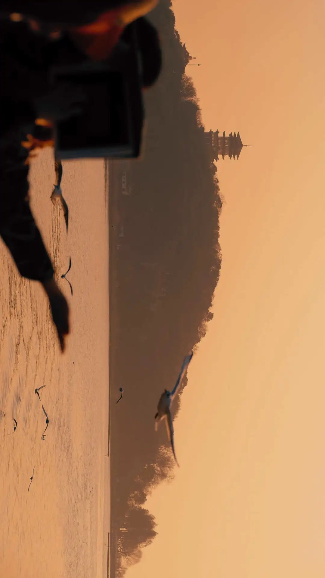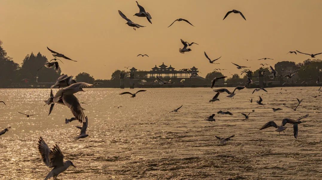 落日余晖倾洒在微波荡漾的湖面上,波光粼粼、金光闪闪,红嘴鸥点缀着这一幕幕画面,与山川湖泊交织成一幅鼋头渚独有的浪漫画卷。夕阳作伴,与鸥共舞,请尽情享受这美好的一刻!