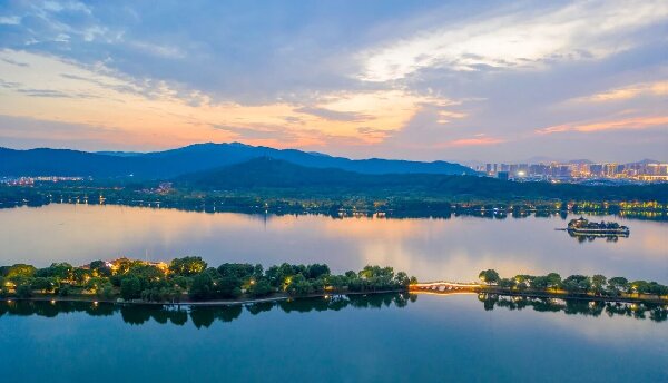 西石湖静谧清幽,偶有飞鸟掠水,激起圈圈涟漪,尽显江南灵动;